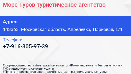 Море Туров, туристическое агентство по адресу 143363, Московская область, Апрелевка, Парковая, 1/1 в дальнейшем Организация, размещена в следующих категориях: