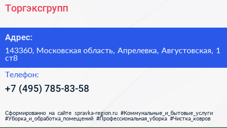 Торгэксгрупп по адресу 143360, Московская область, Апрелевка, Августовская, 1 ст8 в дальнейшем Организация, размещена в следующих категориях: