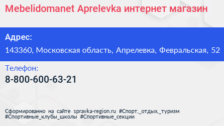 Mebelidomanet-Aprelevka, интернет-магазин по адресу 143360, Московская область, Апрелевка, Февральская, 52 в дальнейшем Организация, размещена в следующих категориях: