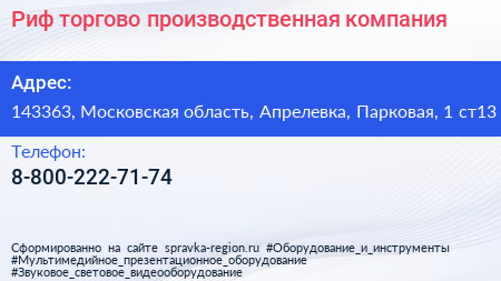 Риф, торгово-производственная компания по адресу 143363, Московская область, Апрелевка, Парковая, 1 ст13 в дальнейшем Организация, размещена в следующих категориях: