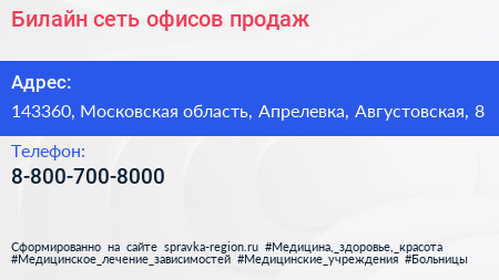 Билайн, сеть офисов продаж по адресу 143360, Московская область, Апрелевка, Августовская, 8 в дальнейшем Организация, размещена в следующих категориях: