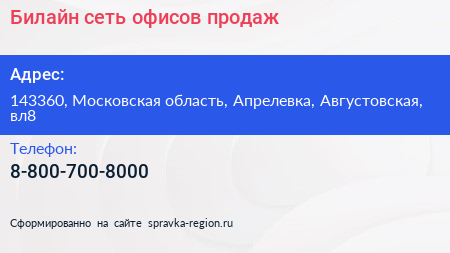 Билайн, сеть офисов продаж по адресу 143360, Московская область, Апрелевка, Августовская, вл8 в дальнейшем Организация, размещена в следующих категориях: