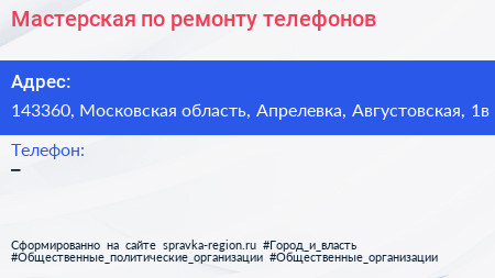 Мастерская по ремонту телефонов по адресу 143360, Московская область, Апрелевка, Августовская, 1в в дальнейшем Организация, размещена в следующих категориях: