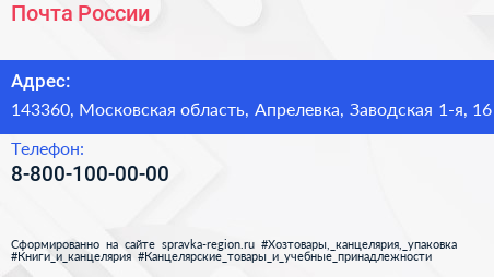 Почта России по адресу 143360, Московская область, Апрелевка, Заводская 1-я, 16 в дальнейшем Организация, размещена в следующих категориях: