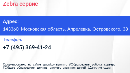 Zebra-сервис по адресу 143360, Московская область, Апрелевка, Островского, 38 в дальнейшем Организация, размещена в следующих категориях: