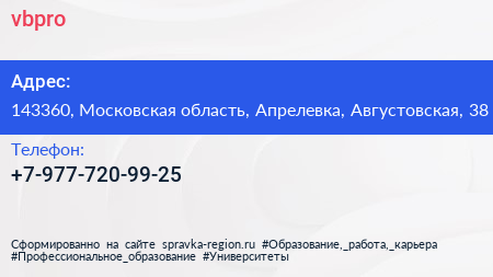 vbpro по адресу 143360, Московская область, Апрелевка, Августовская, 38 в дальнейшем Организация, размещена в следующих категориях: