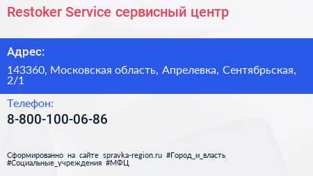 Restoker Service, сервисный центр по адресу 143360, Московская область, Апрелевка, Сентябрьская, 2/1 в дальнейшем Организация, размещена в следующих категориях: