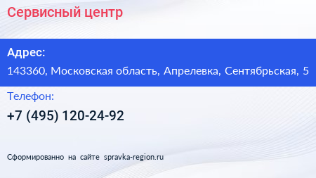 Сервисный центр по адресу 143360, Московская область, Апрелевка, Сентябрьская, 5 в дальнейшем Организация, размещена в следующих категориях: