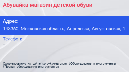 Абувайка, магазин детской обуви по адресу 143360, Московская область, Апрелевка, Августовская, 1 в дальнейшем Организация, размещена в следующих категориях: