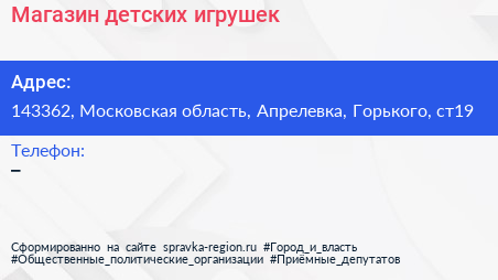 Магазин детских игрушек по адресу 143362, Московская область, Апрелевка, Горького, ст19 в дальнейшем Организация, размещена в следующих категориях: