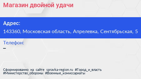 Магазин двойной удачи по адресу 143360, Московская область, Апрелевка, Сентябрьская, 5 в дальнейшем Организация, размещена в следующих категориях: