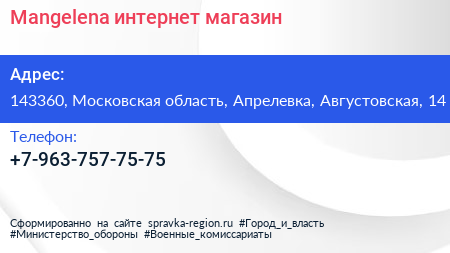 Mangelena, интернет-магазин по адресу 143360, Московская область, Апрелевка, Августовская, 14 в дальнейшем Организация, размещена в следующих категориях: