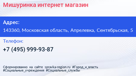 Мишуринка, интернет-магазин по адресу 143360, Московская область, Апрелевка, Сентябрьская, 5 в дальнейшем Организация, размещена в следующих категориях: