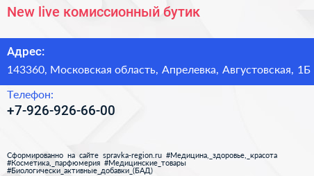 New live, комиссионный бутик по адресу 143360, Московская область, Апрелевка, Августовская, 1Б в дальнейшем Организация, размещена в следующих категориях:
