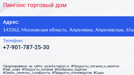 Пингонс, торговый дом по адресу 143362, Московская область, Апрелевка, Апрелевская, 65а в дальнейшем Организация, размещена в следующих категориях: