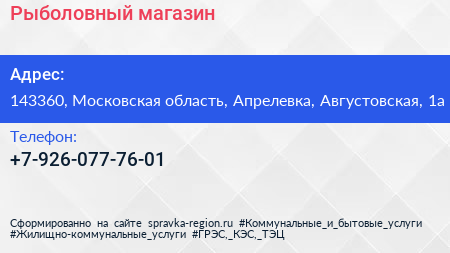 Рыболовный магазин по адресу 143360, Московская область, Апрелевка, Августовская, 1а в дальнейшем Организация, размещена в следующих категориях: