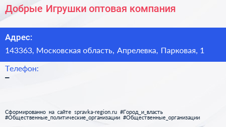 Добрые Игрушки, оптовая компания по адресу 143363, Московская область, Апрелевка, Парковая, 1 в дальнейшем Организация, размещена в следующих категориях: