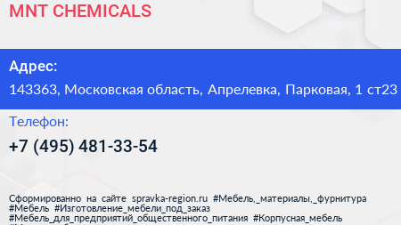 MNT CHEMICALS по адресу 143363, Московская область, Апрелевка, Парковая, 1 ст23 в дальнейшем Организация, размещена в следующих категориях: