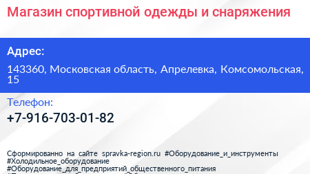 Магазин спортивной одежды и снаряжения по адресу 143360, Московская область, Апрелевка, Комсомольская, 15 в дальнейшем Организация, размещена в следующих категориях: