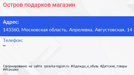 Остров подарков, магазин по адресу 143360, Московская область, Апрелевка, Августовская, 14 в дальнейшем Организация, размещена в следующих категориях: