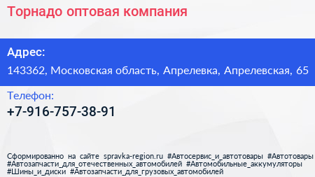 Торнадо, оптовая компания по адресу 143362, Московская область, Апрелевка, Апрелевская, 65 в дальнейшем Организация, размещена в следующих категориях: