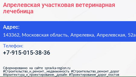 Апрелевская участковая ветеринарная лечебница по адресу 143362, Московская область, Апрелевка, Апрелевская, 52а в дальнейшем Организация, размещена в следующих категориях: