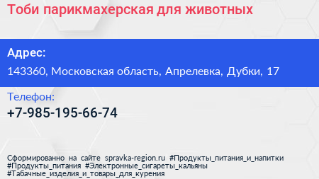 Тоби, парикмахерская для животных по адресу 143360, Московская область, Апрелевка, Дубки, 17 в дальнейшем Организация, размещена в следующих категориях: