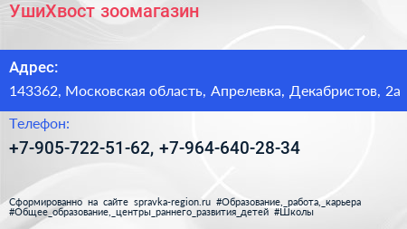 УшиХвост, зоомагазин по адресу 143362, Московская область, Апрелевка, Декабристов, 2а в дальнейшем Организация, размещена в следующих категориях: