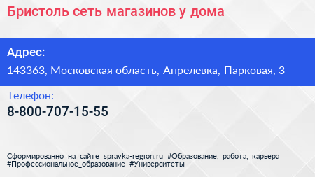 Бристоль, сеть магазинов у дома по адресу 143363, Московская область, Апрелевка, Парковая, 3 в дальнейшем Организация, размещена в следующих категориях: