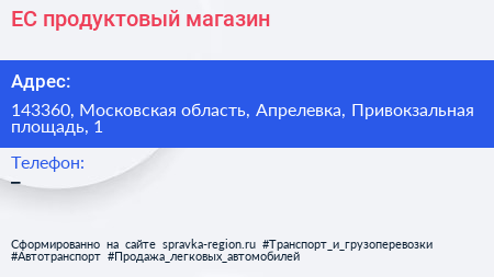 ЕС, продуктовый магазин по адресу 143360, Московская область, Апрелевка, Привокзальная площадь, 1 в дальнейшем Организация, размещена в следующих категориях: