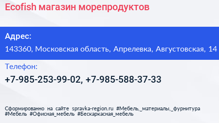 Ecofish, магазин морепродуктов по адресу 143360, Московская область, Апрелевка, Августовская, 14 в дальнейшем Организация, размещена в следующих категориях: