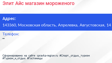 Элит Айс, магазин мороженого по адресу 143360, Московская область, Апрелевка, Августовская, 14 в дальнейшем Организация, размещена в следующих категориях: