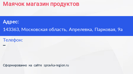 Маячок, магазин продуктов по адресу 143363, Московская область, Апрелевка, Парковая, 9а в дальнейшем Организация, размещена в следующих категориях: