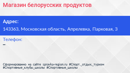 Магазин белорусских продуктов по адресу 143363, Московская область, Апрелевка, Парковая, 3 в дальнейшем Организация, размещена в следующих категориях: