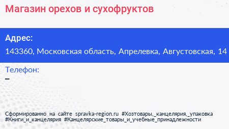 Магазин орехов и сухофруктов по адресу 143360, Московская область, Апрелевка, Августовская, 14 в дальнейшем Организация, размещена в следующих категориях: