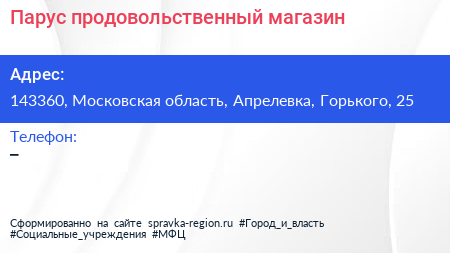 Парус, продовольственный магазин по адресу 143360, Московская область, Апрелевка, Горького, 25 в дальнейшем Организация, размещена в следующих категориях: