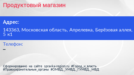 Продуктовый магазин по адресу 143363, Московская область, Апрелевка, Берёзовая аллея, 5 к1 в дальнейшем Организация, размещена в следующих категориях: