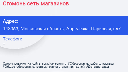 Сгомонь, сеть магазинов по адресу 143363, Московская область, Апрелевка, Парковая, вл7 в дальнейшем Организация, размещена в следующих категориях: