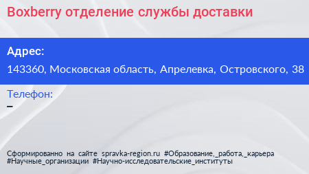 Boxberry, отделение службы доставки по адресу 143360, Московская область, Апрелевка, Островского, 38 в дальнейшем Организация, размещена в следующих категориях: