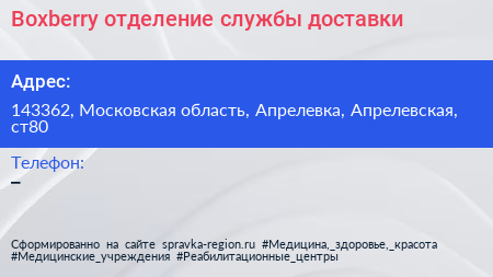 Boxberry, отделение службы доставки по адресу 143362, Московская область, Апрелевка, Апрелевская, ст80 в дальнейшем Организация, размещена в следующих категориях: