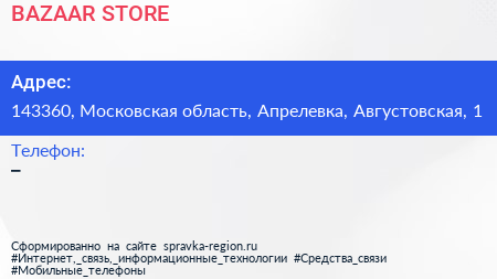 BAZAAR STORE по адресу 143360, Московская область, Апрелевка, Августовская, 1 в дальнейшем Организация, размещена в следующих категориях:
