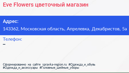 Eve Flowers, цветочный магазин по адресу 143362, Московская область, Апрелевка, Декабристов, 5а в дальнейшем Организация, размещена в следующих категориях: