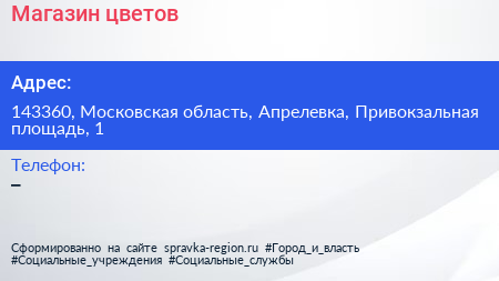 Магазин цветов по адресу 143360, Московская область, Апрелевка, Привокзальная площадь, 1 в дальнейшем Организация, размещена в следующих категориях: