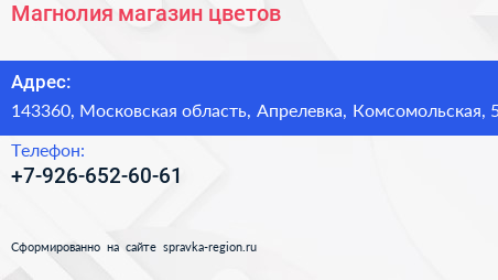 Магнолия, магазин цветов по адресу 143360, Московская область, Апрелевка, Комсомольская, 5 в дальнейшем Организация, размещена в следующих категориях: