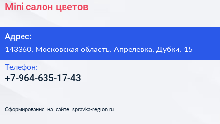 Mini, салон цветов по адресу 143360, Московская область, Апрелевка, Дубки, 15 в дальнейшем Организация, размещена в следующих категориях: