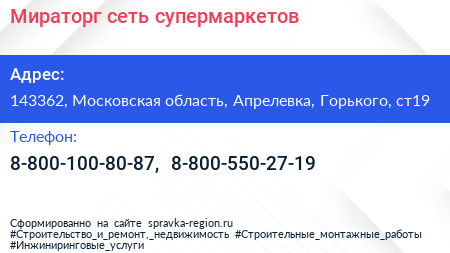 Мираторг, сеть супермаркетов по адресу 143362, Московская область, Апрелевка, Горького, ст19 в дальнейшем Организация, размещена в следующих категориях: