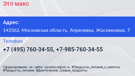 Этл-макс по адресу 143362, Московская область, Апрелевка, Жасминовая, 7 в дальнейшем Организация, размещена в следующих категориях: