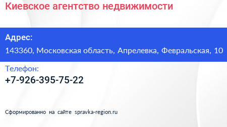 Киевское, агентство недвижимости по адресу 143360, Московская область, Апрелевка, Февральская, 10 в дальнейшем Организация, размещена в следующих категориях: