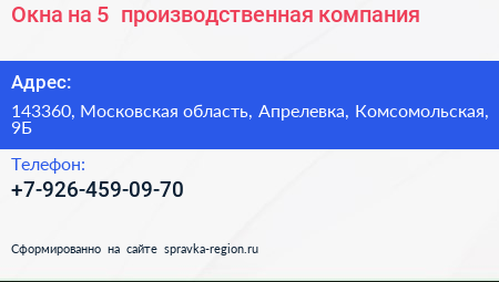 Окна на 5+, производственная компания по адресу 143360, Московская область, Апрелевка, Комсомольская, 9Б в дальнейшем Организация, размещена в следующих категориях: