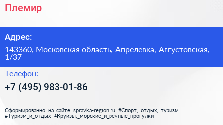 Племир по адресу 143360, Московская область, Апрелевка, Августовская, 1/37 в дальнейшем Организация, размещена в следующих категориях: